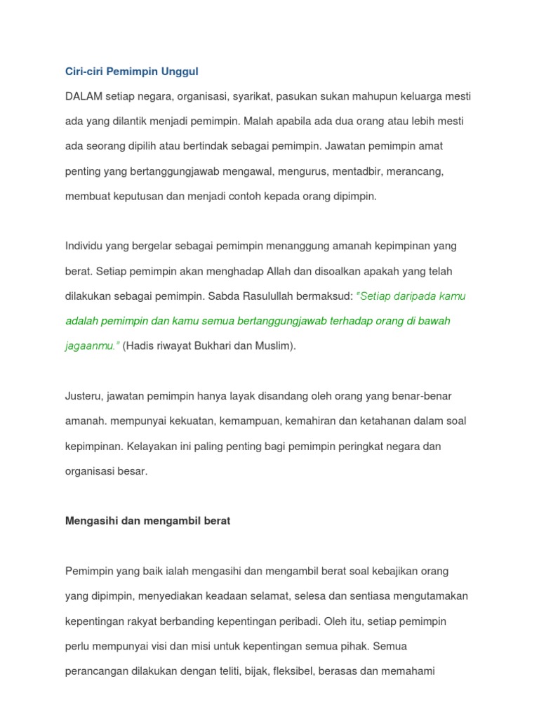 Baik dan buruk perusahaan bergantung pada tindakan leader. Kerangka karangan juga dibentuk secara berurutan dan sistematis. Teladan baik pemimpin masyarakat.